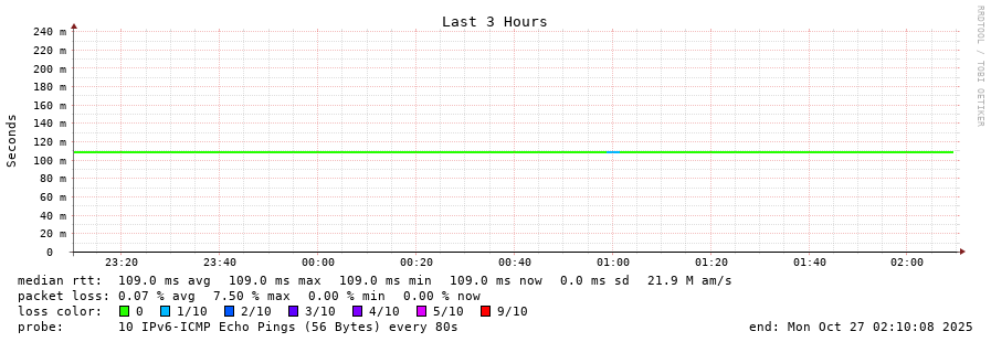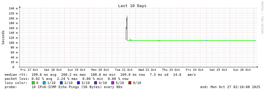 traceroute to 2a00:c30:bbbb:d::2 (2a00:c30:bbbb:d::2), 30 hops max, 80 byte packets - Generated at 2025-10-27 01:00:01